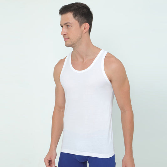 Men's Super Combed White Cotton Round Neck Sleeveless Vest