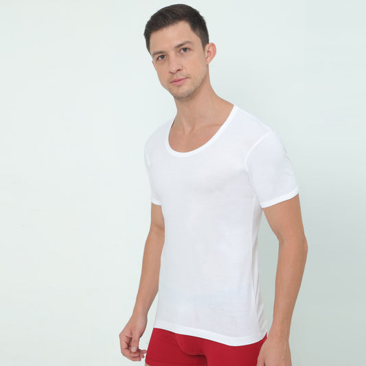 Men's Super Combed White Cotton Round Neck Half Sleeved Vest